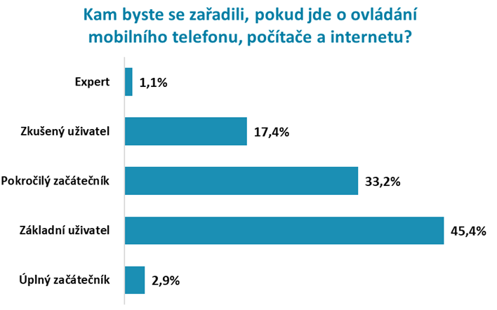 Podle nejnovějších dat projektu Neviditelní a značky Creditea si lidé ve věku 65-99 let při využívání elektroniky či internetu více věří, jen pouhá 2 až 4 % dotazovaných se považuje za úplného začátečníka co do ovládání svého telefonu, počítače či internetu. Naopak zhruba 17 % seniorů se považuje za zkušené uživatele s dobrou znalostí pokročilých funkcí a aplikací, orientují se v nastavení zařízení či internetu a umí vyřešit běžné technické problémy. Nejčastěji (44 až 47 %) se však senioři hodnotí jako základní uživatelé, kteří umí vykonávat jednoduché úkony.