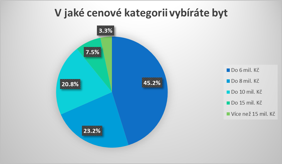 Zájemci o koupi nového bytu se chtějí vejít do šesti milionů korun, za to si ale v Praze pořídí jen malou jednopokojovou garsonku. A to navíc pouze v případě, že budou mít štěstí a dostanou se k nabídce nového rezidenčního projektu mezi prvními. „ Zájem o nejmenší byty je největší a z ceníků tak zmizí velmi rychle. Podstatným faktorem je samozřejmě koncová cena, která je u malých bytů nižší než u větších vícepokojových bytů. Ty jsou ale zase levnější při přepočtu na metr čtvereční,“ vysvětluje developer Korec a dodává, že nových bytů s cenovkou do šesti milionů korun je na pražském trhu naprosté minimum. Zhruba čtvrtina (23,2 procenta) kupujících proto hledá v kategorii do osmi milionů. Více než 15 milionů korun chce vynaložit jen 3,3 procenta respondentů.