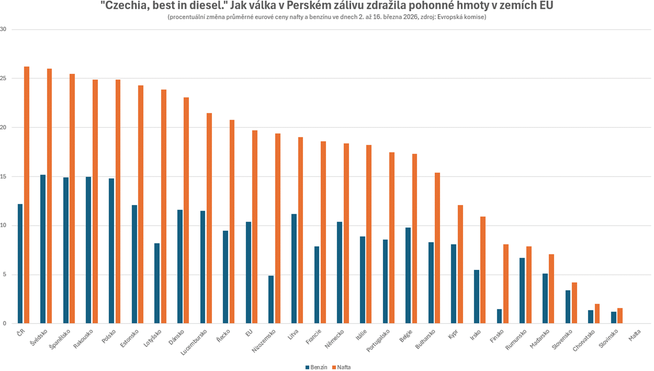 Česku opět náleží jeden primát v rámci zemí EU. Motorová nafta totiž v ČR zdražila v reakci na válku v Íránu vůbec nejvýrazněji ze všech zemí EU, a to v přepočtu do eur o 26,2 procenta, odhalují dnešní nová data Evropské komise (viz graf níže).