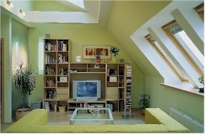 Manželé se rozhodli pro střešní okna Velux (výklopná, typ GPL s ventilační klapkou). Velkou důležitost přisoudil architekt jejich výškovému osazení, protože možnosti výhledu, které byt nabízí, jsou opravdu velkolepé. Zeleň obklopuje dům ze tří stran a krajina se táhne, kam až oko dohlédne. Při dobré viditelnosti je vidět dokonce až na Pálavu. „Tuto otázku jsme vyřešili detailem umístění okna v nice s parapetem,“ vysvětluje architekt, „okno je hlouběji a níže zapuštěno a jeho spodní rám se tak dostává na žádanou výšku asi metr nad podlahou. Navíc pod parapetní deskou k oknu správně proudí vzduch od topení, umístěného pod okny. Kritický detail tloušťky tepelné izolace kolem rámu oken vyřešil tepelně izolační rám Velux.“