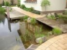 U přírodních bazénů se často při úpravě okolí kombinuje kamenná dlažba s dřevem, které může navázat až nad hlubokou část jezírka, aby vytvořila molo doplněné schůdky pro snadnější výstup z vody. Protože je každý biotop bazén na míru, záleží na fantazii vaší či zahradního architekta, jaký bude mít tvar a jaké materiály se k úpravě okolí použijí.