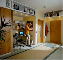 V pokoji studenta by neměla chybět šatní skříň hluboká alespoň 58-60 cm pro uložení osobního oblečení. Součástí skříně by kromě šatní tyče pro zavěšení ramínek měly být otevřené fochy na trička, mikiny a svetry a dále zásuvky na drobné spodní prádlo, šátky, šály, rukavice a ponožky. Pro pohodlný přístup ke skříni a případně manipulační prostor pro převlékání bychom před skříní měli pamatovat na volný prostor široký alespoň 80 cm. Místo nám dokážou prakticky ušetřit vodorovně posuvné dveře skříně.