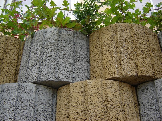 Betonové výrobky se mohou hodit také při zpevňování terénu. K tomuto účelu se vyrábějí svahové tvárnice. Jde o systém takzvaného suchého zdění, kdy jsou tvárnice kotveny proti posunutí vlastním zámkovým tvarem a později pokrývány násypem. Rozhodneme-li se pro zídku právě z tohoto materiálu, pak určitě věnujme dostatečnou pozornost kvalitní výstavbě. Za zdí musí být umístěna filtrační vrstva a fólie, která omezí výskyt vápenných výkvětů. Nutností je také drenáž pro odvedení srážkové vody uvnitř zdi. Opomeneme-li tento nezbytný doplněk, hrozí výskyt mokrých skvrn i znečištění povrchu vyplavenou zeminou. Celou stěnu stavíme na základový pás z betonu a ještě ji ze zadní strany odizolujeme vrstvami štěrku. Pro výstavbu okrasných lemů či skalek jsou oblíbené vibrolisované tvárnice okrouhlého tvaru s vykrojením a výrazným hrubozrnným povrchem. Stěny z těchto tvárnic mohou být kolmé, vyhoví ale i svahu o sklonu 60 stupňů. V případě zdí vyšších než 1,2 metru je vhodné konzultovat statiku stěny s odborníkem. Do hotových stěn můžeme vysázet nejrůznější trvalky či jiné okrasné dřeviny (kořeny rostlin ještě navíc přispějí ke zpevnění celé stěny), berme však na vědomí, že taková zeď má pouze estetickou funkci, nikoliv opěrnou.