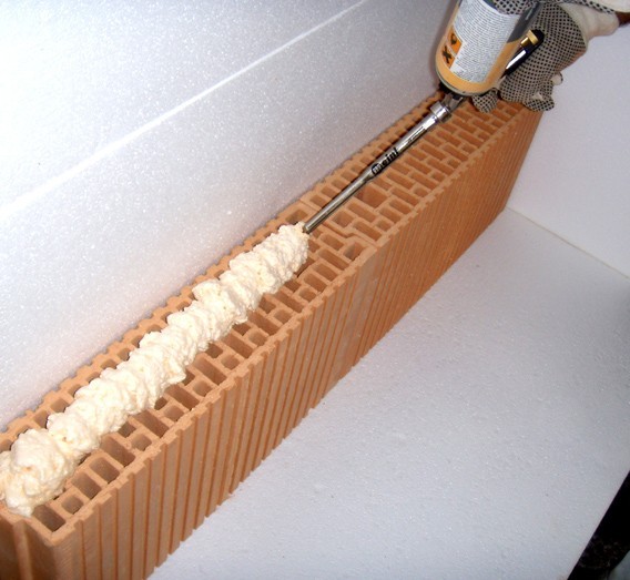 Pěna se na cihly nanáší ve dvou pruzích, na tenké příčky pouze v pruhu jediném. Do nanesené pěny se cihla musí usadit nejpozději do 3 minut.