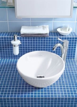Kulaté umyvadlo určené k postavení na desku. Prodávají se varianty kruh, ovál, vlna, čtverec i obdélník k postavení na desku, či zabudování. Vhodný nábytkový program Central Line, Shape, Loop. (Villeroy&Boch)
