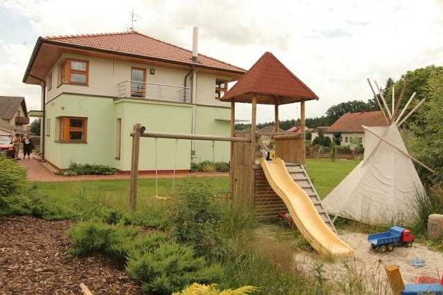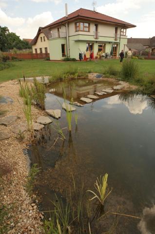Zahradě se majitelé rozhodli ponechat přírodní ráz. Má tři opěrné body, z nichž dominantní je brouzdací jezírko. To je určeno především dětem, ale v letních měsících ho k osvěžení rádi využijí i dospělí. Dalším výrazným bodem je kopeček vytvarovaný z hlíny ze základů porostlý okrasnou vegetací. Prostor za touto vyvýšeninou pak patří dětem, kde kromě pískoviště mají i další atrakce. Třetí dominantu zahrady pak tvoří hájek, který skladbou stromů plynule navazuje na les.