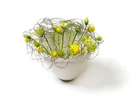 Prvním krokem při výrobě aranžmá je omotání okraje misky hliníkovým drátem. Motejte tak, aby drát tvořil velká oka, ale zase ne tak moc velká. Oka by měla poskytnout oporu květům, které do nich budeme vkládat. Omotejte drát kolem misky tak, jak vidíte na fotografii.