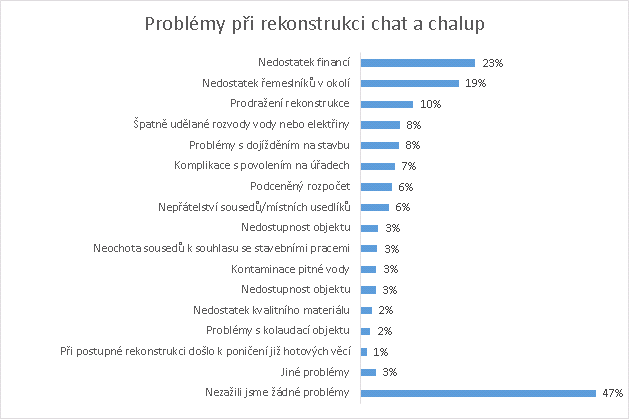 Rekonstrukce s sebou často přináší i komplikace, problémy spojené s úpravami druhého bydlení zažil každý druhý majitel chaty. Mezi ty nejčastější patří podle průzkumu Buřinky nedostatek financí, ten trápí čtvrtinu rekonstruujících, 6 % dotázaných podcenilo rozpočet již ve fázi plánování a dalších 10 % řešilo prodražení úprav. „Přeměny chat a chalup na trvalé bydlení probíhají často na dálku, což ztěžuje koordinaci prací a domluvu s řemeslníky. Postupně se také může ukázat, že stavba byla v horším stavu, než se původně čekalo. To všechno úpravy prodraží, proto doporučujeme počítat aspoň s 15% rezervou,“ radí Monika Kopřivová, ze Stavební spořitelny České spořitelny.