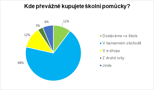 Přesto, že online obchody mají mnohem širší nabídku školních pomůcek, tak rodiče upřednostňují nákupy v kamenných prodejnách. Pouze 12 % rodičů nakupuje pomůcky na internetu, oproti tomu některý z typů kamenné prodejny, ať již jde o papírnictví nebo supermarket, upřednostňuje 68 % nakupujících. Jedenáct procent dětí dostává školní pomůcky ve škole. Často jde o školy, kde na nákup všem přispívá samotná obec, tedy zřizovatel školy.