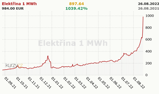 Většina spotřebitelů si fixuje ceny energií alespoň na rok, na trhu jsou tak jako vodítko sledovány především roční kontrakty. Pro příští rok cena domácí „základní“ elektřiny jen za tento týden svou hodnotu zdvojnásobila. V pátek totiž zakončila již v blízkosti hranice 1 000 EUR na 984 EUR/MWh (přes 24 Kč/kWh). Pro „peakové“ časy pak cena dokonce překročila hranici 1 300 EUR/MWh.
