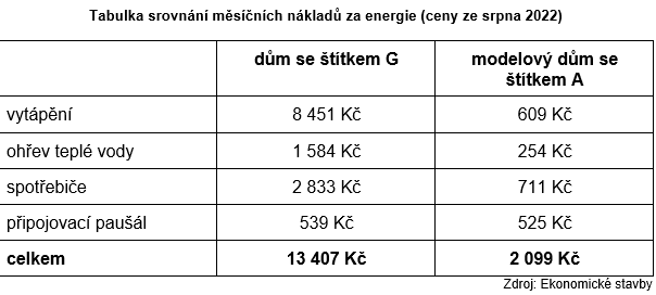 V domě s nejnižším energetickým štítkem tedy měsíčně zaplatíte přes 13 tisíc místo 2 tisíc, ročně přes 160 tisíc místo 25 tisíc. Provoz domu se štítkem G je tedy o více než 135 tisíc ročně dražší než zvolené referenční řešení. A co je vlastně toto moderní, nízkoenergetické řešení s vysokým štítkem zač?