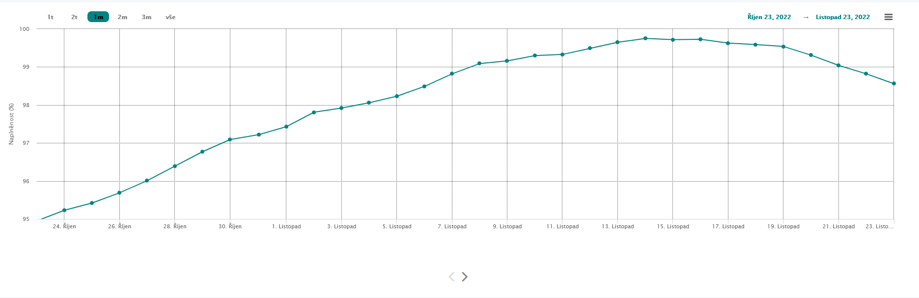 K poklesu zásob plynu dochází 1% za 4 dny, aktuálně jsou zásoby na 98,5 %, maximálně bylo skoro plno 99,75 % dne 14. 11. 2022
