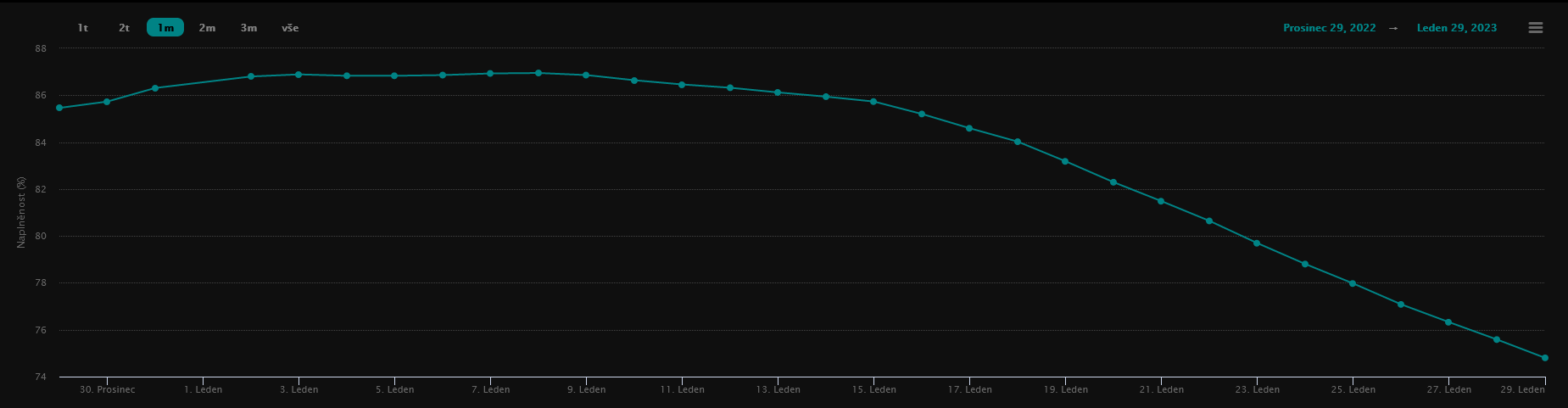 Zásoby plynu v Česku k 29. 1. 2023 - aktuální naplněnost zásobníků je 74,8 %