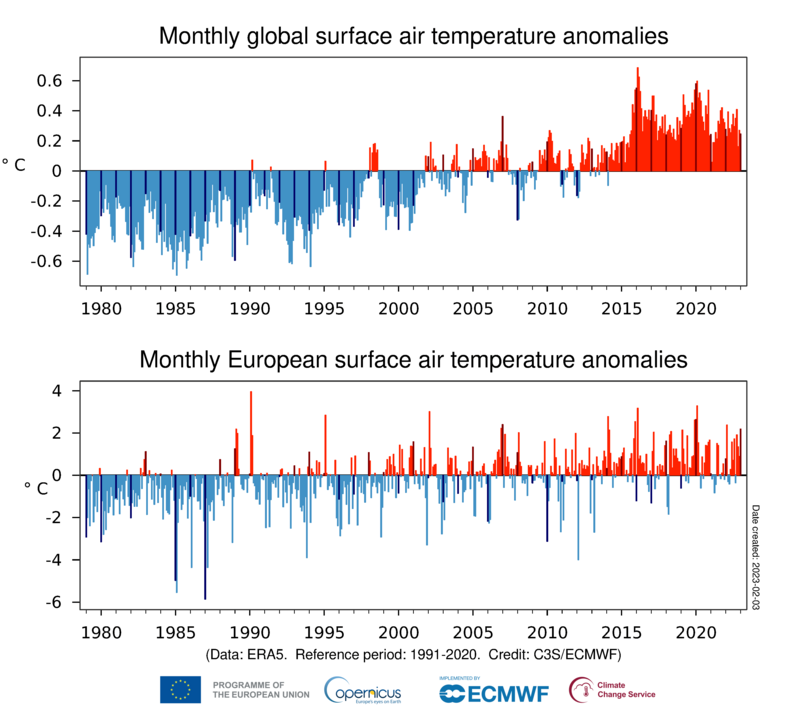 Měsíční průměrné globální a průměrné evropské anomálie přízemní teploty vzduchu ve vztahu k období 1991-2020, od ledna 1979 do ledna 2023. Tmavší barevné sloupce označují lednové hodnoty. Zdroj dat: ERA5. Zdroj: Copernicus Climate Change Service/ECMWF