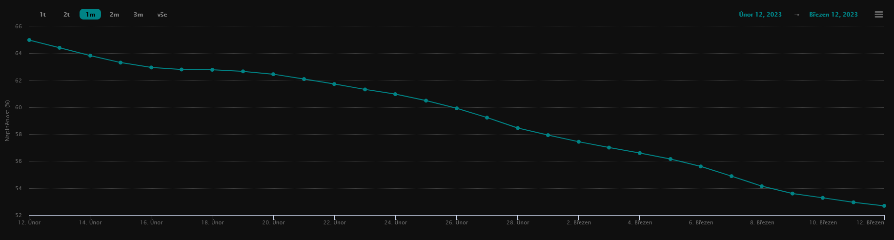 Zásobníky byly k 12.3. naplněny z 52,95 %, resp. činí 19 423,9 GWh plynu (kapacita zásobníků dosahuje celkem 36 856 GWh).