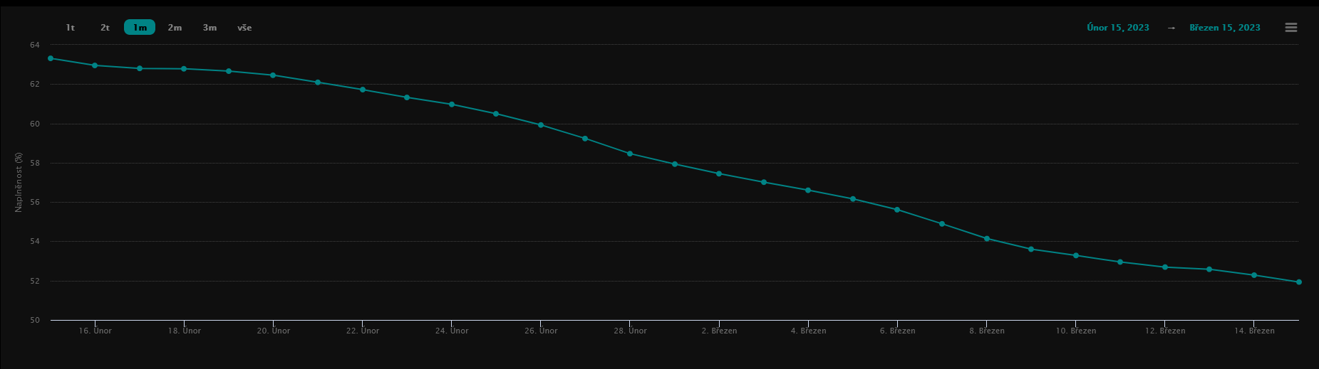 Zásobníky byly k 15.3. naplněny z 514,93 %, resp. činí 19 145,5 GWh plynu (kapacita zásobníků dosahuje celkem 36 856 GWh).
