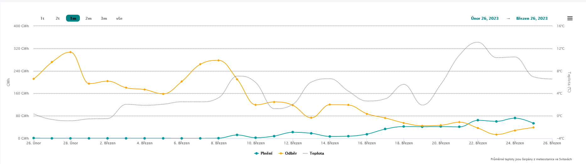 Ohledně spotřeby možno zmínit, že dle posledních dat k 25.3. dosáhla 176,45 GWh, zatímco do ČR ve stejný den přiteklo celkem přes 191 GWh plynu.