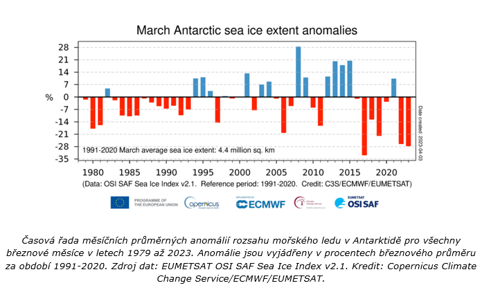 Copernicus: Svět zažil druhý nejteplejší březen v historii měření. Antarktický mořský led dosáhl druhého nejnižšího rozsahu