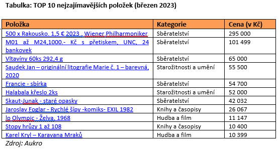 Na prvním místě pomyslného žebříčku aukcí největšího českého online tržiště Aukro se za březen umístily stříbrné investiční mince Wiener Philharmoniker. „Box obsahoval 500 kusů mincí o nominální hodnotě 1,5 euro. Prodej za téměř 300 tisíc korun ukazuje, že jsou tyto mince stále vnímány jako bezpečné uložení majetku,“ uvedl Pavel Krejčíř, expert na sběratelství a starožitnictví portálu Aukro s tím, že v březnu na Aukru proběhly ještě další dva prodeje těchto boxů s investičními mincemi, což jen v rámci zmíněných 3 transakcí znamenalo 1 500 prodaných mincí za téměř 900 000 korun.