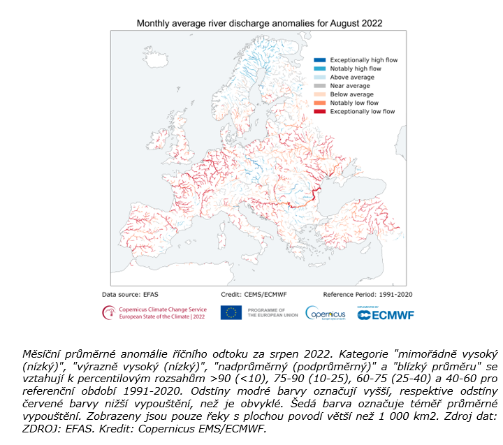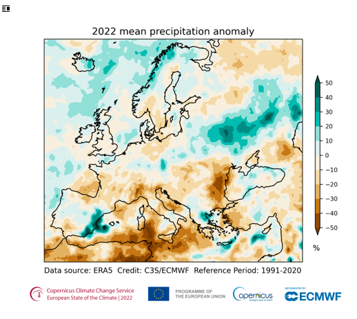Roční anomálie půdní vlhkosti byla druhá nejnižší za posledních 50 let, pouze v ojedinělých oblastech byla vlhkost půdy vyšší než průměrná. Kromě toho byly průtoky v řekách v Evropě druhé nejnižší v historii, což představuje šestý rok v řadě s podprůměrnými průtoky. Z hlediska postižené oblasti byl rok 2022 nejsušším rokem v historii měření, přičemž 63 % evropských řek zaznamenalo nižší než průměrné průtoky.