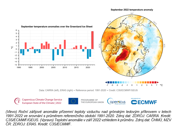 Během roku 2022 se extrémní klimatické podmínky vyskytly také v Grónsku, včetně mimořádných veder a srážek v září, tedy v ročním období, pro které je typičtější sníh. Průměrné teploty v tomto měsíci byly až o 8 °C vyšší než průměr (nejvyšší v historii) a ostrov postihly tři různé vlny veder. Tato kombinace způsobila rekordní tání ledové pokrývky, přičemž na vrcholu první vlny veder bylo zasaženo nejméně 23 % ledové pokrývky.