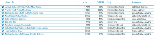Víc než 1,7 milionů lidí loni jelo lanovkou na Petřín. Tato zážitková doprava se tak stala vůbec nejnavštěvovanějším turistickým cílem roku 2022. Do první desítky se probojoval také Pražský hrad, ZOO Praha, Aquapalace v Čestlicích, Dolní Vítkovice v Ostravě, ZOO Zlín, Aqualand Moravia Pasohlávky, Safari Park Dvůr Králové, Hrad Špilberk v Brně a Zoologická zahrada Ostrava. Z přehledu, který Česká centrála cestovního ruchu – CzechTourism sestavila ve spolupráci s kraji, je zřejmé, že turisty podobně jako loni nejvíc lákaly ZOO, zábavní turistické cíle a hrady a zámky.
