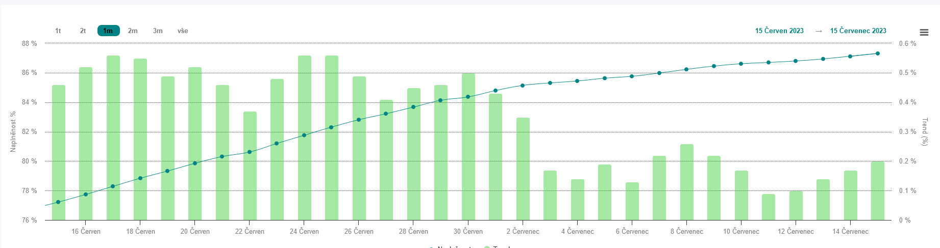 Zvýšená zimní energetická spotřeba se nadále již neprojevuje na poklesu zásob plynu. Zásobníky byly k 15. 7. naplněny z 87,31 %, resp. činí 32 705,4 GWh plynu.
