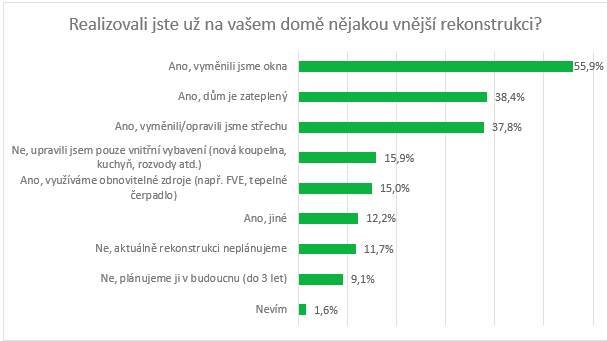Podle průzkumu Buřinky třetina českých rodinných domů nikdy neprošla žádnou vnější rekonstrukcí, přitom jejich průměrné stáří je dle údajů ČSÚ 51 let. Více než polovina domů má nová okna, třetina je zateplená nebo po výměně či opravě střechy. Trojskla s lepšími tepelně-izolačními vlastnostmi má jen necelá čtvrtina lidí, zateplení fasády silnější než 16 cm jen 5 %. Rekonstrukce, které povedou k úspoře energií, stále více podporuje stát. Nyní také ve spolupráci se stavebními spořitelnami. Ty kromě financování budou od nového roku nabízet také asistenci při vyřízení dotací. Majitelé rodinných domů se mohou chopit příležitosti, jak se s předstihem a v klidu připravit na celoevropskou energetickou transformaci.