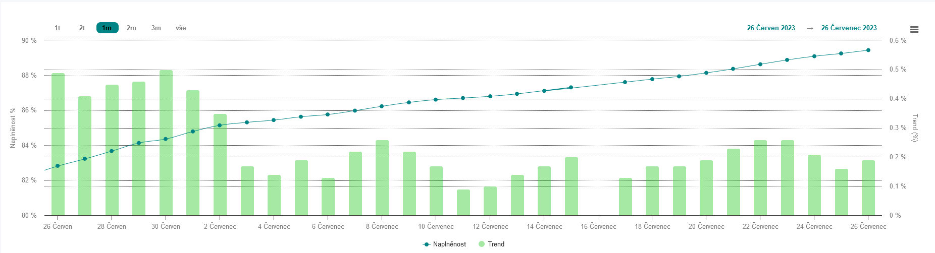 Zvýšená zimní energetická spotřeba se nadále již neprojevuje na poklesu zásob plynu. Zásobníky byly k 26. 7. naplněny z 89,44 %, resp. činí 37 457,4 GWhplynu. Ze statistiky týkající se zásob plynu určených pro spotřebu v Česku vyplývá, že při průměrné roční spotřebě by současné zásoby vydržely na 133 dnů. Při zohlednění zimní spotřeby pak 76 dnů. Pokud by se zásoby měly využít v zimním období pouze pro domácnosti, vystačily by na 293 dnů. Plnění zásobníků se poslední dny pohybuje nad úrovní 72,72 GWh. Ohledně spotřeby možno zmínit, že dle posledních dat dosáhla 0,8 GWh/den. Pokud bude i nadále plnění pokračovat tímto tempem, dá se předpokládat, že zásobníky se naplní už v srpnu.