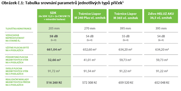 Při stejné tloušťce dosahují mezibytové příčky často lepších akustických výsledků než některé zděné příčky. „Výsledky měření v profesionální zkušebně prokázaly, že lehké stěny mají lepší akustické vlastnosti než běžně používané akustické stěny z těžkých tvárnic, a to i po zohlednění oslabení s prostupy pro běžnou elektroinstalaci. Navíc SDK stěny jsou užší a šetří místo,“ vysvětluje Marcela Kubů z Asociace výrobců minerálních izolací a dále pokračuje: „Developer tak při jejich použití u běžného projektu čtyřpodlažního domu o 16 bytech může zvětšit obytnou plochu až o 27 metrů čtverečních, přepočteno na peníze (při ceně 45 000 korun za metr) jde o zhodnocení vyšší než 1,2 milionu korun.“