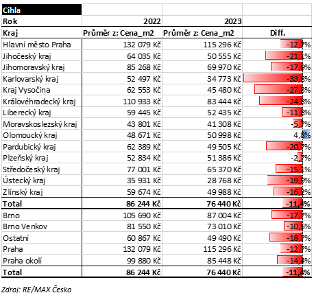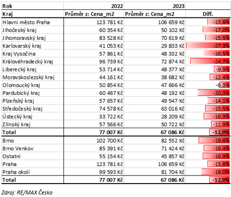 „Srovnání cen je provedeno pouze pro transakce uzavřené v první polovině roku 2022 a 2023, což umožňuje lépe porovnat, co se na trhu skutečně děje. Mezi jednotlivými regiony a segmenty jsou samozřejmě rozdíly, ale nejvíce klesly ceny bytů ve starších panelových domech v regionech, kde ceny dříve nejvíce rostly, například v okolí Prahy a Brna. Zajímavá je situace v Praze, kde ceny meziročně klesly o 14 %, ale u panelových domů v průměru o téměř 18 % a u cihlových jen o 12 %. Pokles je citelnější u větších bytů nad cca 70 m2 obytné plochy,“ doplňuje analytik a realitní znalec Iztok Toplak z RE/MAX G8 Reality