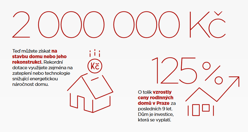 Už od září startuje další kolo dotací Nová zelená úsporám od Ministerstva životního prostředí. Program bude nejen dostupnější, ale lze získat rekordní objemy peněz. Investor může celkem zažádat o dotaci do výše až 2 milionů korun. Příspěvek se vztahuje jak na zateplení takzvaného “domu po babičce,” (výměna obvodového zdiva, zateplovací systémy, obnova střešního pláště, oken a stínící techniky), tak na obnovitelné zdroje energie (fotovoltaické systémy, rekuperační jednotky, kotle, kamna a tepelná čerpadla), nebo i využití dešťové vody a například i nabíjecí stanici pro elektromobily. Mladé rodiny mohou k tomu všemu obdržet i bonus 50 tisíc korun na každé nezaopatřené dítě, ve stejné výši bonus na zpracování projektu nutného pro podání žádosti o čerpání dotace a bonus 10 tisíc korun za kombinaci více opatření. Domácnosti z Karlovarského, Moravskoslezského, Ústeckého kraje a z obcí podporovaných státem, zase získají bonus 10 % z celkové výše dotace. Své si najdou ale i investoři novostaveb, kteří mohou zažádat o finanční příspěvek v rozmezí od 200 tisíc do 500 tisíc korun a k tomu ještě až 35 tisíc na projektovou přípravu domu. Zákazník navíc může vzhledem k volným kapacitám na trhu realizovat stavbu v krátkém časovém období.