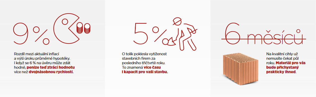 Proces výstavby nebo rekonstrukce může trvat měsíce, dokonce roky, a proto je vhodné se co nejdříve pustit do projektu, abyste mohli začít žít ve svém vysněném domově. K tomu nahrává i momentální situace stavebních firem, které jsou po dlouhé době dostupnější a vychází vstříc i termínově. Za posledních devět měsíců klesla vytíženost stavebních firem o 5 % - to znamená více času i kapacit pro vaši stavbu. Začít stavět je výhodné i z hlediska dostupného stavebního materiálu a krátkých dodacích lhůt. Žádných 6 měsíců. Vybraný materiál máte na stavbě už za pár dní.