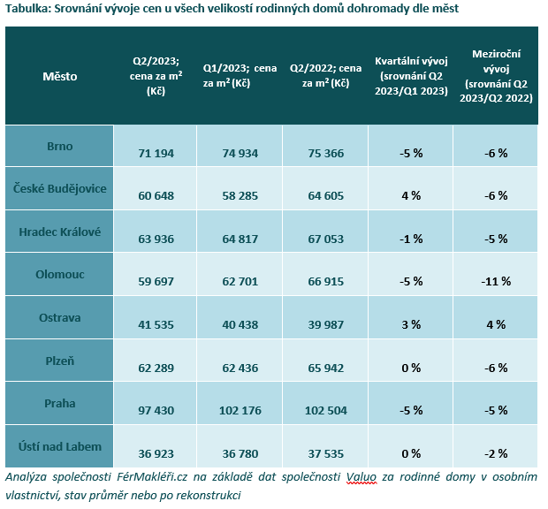 Ceny klesaly i kvartálně. Oproti začátku tohoto roku pak touto optikou ukázalo stagnaci cen Ústí nad Labem a Plzeň – starší dům tam šlo začátkem léta koupit za podobné ceny jako na přelomu letošní zimy a jara. Růst cen v kvartálním srovnání vykázala opět Ostrava a vedle ní i České Budějovice. V ostatních sledovaných městech ceny klesaly