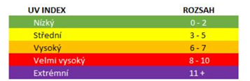 UV index je stupnice používaná při měření slunečního ultrafialového záření, podle kterého by měla být volena vhodná ochrana našeho těla. UV index je nedílnou součástí správné předpovědi počasí a odborníci radí i tuto hodnotu sledovat s tím, že dle konkrétní hodnoty v daný den je nutné zvolit přiměřenou ochranu.