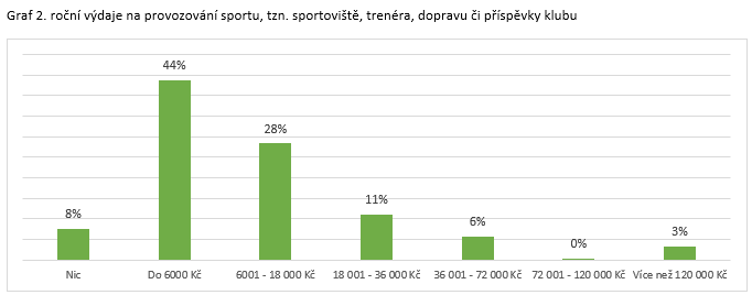 Ještě více pak vydají Češi za provozování sportu, tzn. sportoviště, trenéra, dopravu či příspěvky klubu. Nejčastěji ročně do 6 tisíc Kč (44 %), dále 6 tisíc – 18 tisíc Kč (28 %), 18 tisíc – 36 tisíc Kč (11 %), 36 tisíc – 72 tisíc Kč (6 %), 72 tisíc – 119 tisíc Kč (0,4 %), ale více než 120 tisíc Kč 3 %.