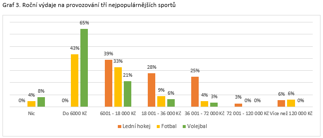 Když se podíváme na výdaje na provozování tří nejpopulárnějších sportů, pak mezi nejdražší patří lední hokej, za který 62 % hráčů utratí ročně více než 18 tisíc Kč, dokonce přes 120 tisíc Kč pak zaplatí 6 % hokejistů. Fotbal je levnější, 80 % hráčů utratí ročně méně než 18 tisíc Kč. A 73 % hráčů volejbalu utratí méně než 6000 Kč ročně. S minimálními, téměř nulovými ročními náklady lze za určitých podmínek hrát fotbal a volejbal, nepodaří se to však hokejistům.