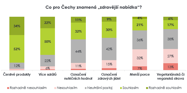 Češi se domnívají, že dokáží rozeznat zdravé jídlo od nezdravého. Mají podle svého vlastního zhodnocení také základní přehled o zásadách správného stravování – mnohdy je pro ně ale obtížné je dodržovat. Vyplývá to z robustního evropského průzkumu Barometr FOOD [1] , který proběhl letos v létě pod záštitou Evropské komise. Z více než 4 500 odpovědí vyplynulo, že Češi zdravost pokrmu hodnotí zejména na základě čerstvosti ingrediencí (85 %) a množství salátů či zeleniny (72 %). V mnohem menší míře jako zdravé vnímají menší porce (25 %) nebo vegetariánskou a veganskou stravu (23 %). Oproti zbytku Evropy se navíc při rozhodování, kde a co jíst, mnohem méně řídí výživovou hodnotou jídel.