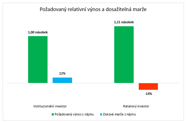 Jak dokládá modelový příklad, při pořízení a provozování bytu 3+kk o velikosti 72 m2 může individuální investor dosáhnout až o 21 % vyššího nájmu, ale i přesto dosahuje spíše záporného zisku. Velcí institucionální investoři jsou totiž při nákupu většího množství bytů schopni získat množstevní slevy a nákupy financují za výrazně výhodnějších finančních podmínek. Provoz, údržbu a správu svých nemovitostí také realizují levněji, a to díky úsporám z rozsahu. Institucionální trh nájemního bydlení tak může pro obě smluvní strany nabídnout nejen předvídatelnější, dlouhodobější a udržitelnější vztah, ale může sloužit také jako reference nejlepší praxe z hlediska stanovování nájemného, smluvních zvyklostí a jejich kvality, od kterého se může učit zbytek fragmentovaného C2C [1] trhu.
