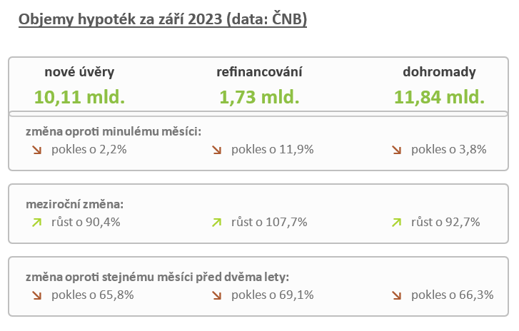 Pokud září 2023 vůbec něčím překvapilo, pak snad jen tím, že nepřineslo nic překvapivého. Objem hypotečních úvěrů poskytnutých v září dosáhl 11,84 mld. Kč, což oproti srpnovým 12,3 mld. znamená meziměsíční vývoj, který nejlépe vystihneme odborným termínem "plus mínus autobus".