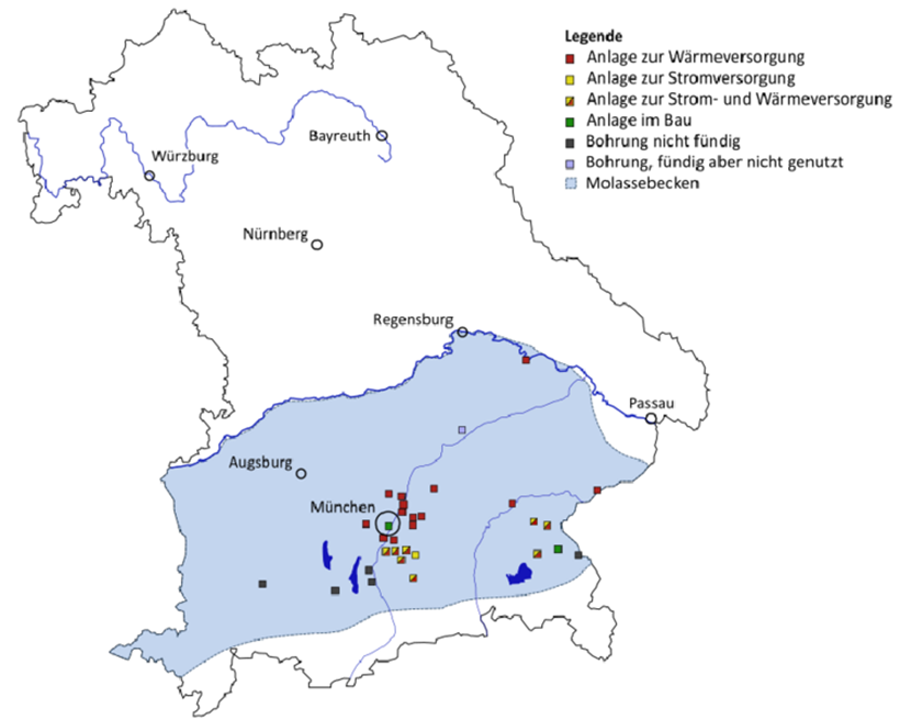 Největší počet geotermálních elektráren v Německu se momentálně nachází v okolí Mnichova. Řadu z nich provozuje společnost Stadtwerke München, na výrobu tepla jsou využívány např. elektrárny v Riemu, Sauerlachu či Freihamu. Nejvýkonnější je geotermální elektrárna na jihu Mnichova ve čtvrti Sendling, která zásobuje 80.000 domácností. Stadtwerke München nedávno oznámila realizaci nové vědecké studie „Giga M“ pod vedením Ústavu hydrogeologie Technické univerzity v Mnichově. Cílem studie je vypracování návrhu postupu pro propojení jednotlivých geotermálních elektrárenv okolí Mnichova za účelem zvýšení výkonu ze 400 megawattů na jeden gigawatt. Vědci z Technické univerzity v Mnichově vyzývají ke zrychlené výstavbě nových geotermálních elektráren, do roku 2030 požadují realizaci 100 nových projektů. V rámci studie „Giga M“ má vědecký tým dále navrhnout ideální postup pro výstavbu nových elektráren a podněty pro zjednodušení povolovacích řízení.