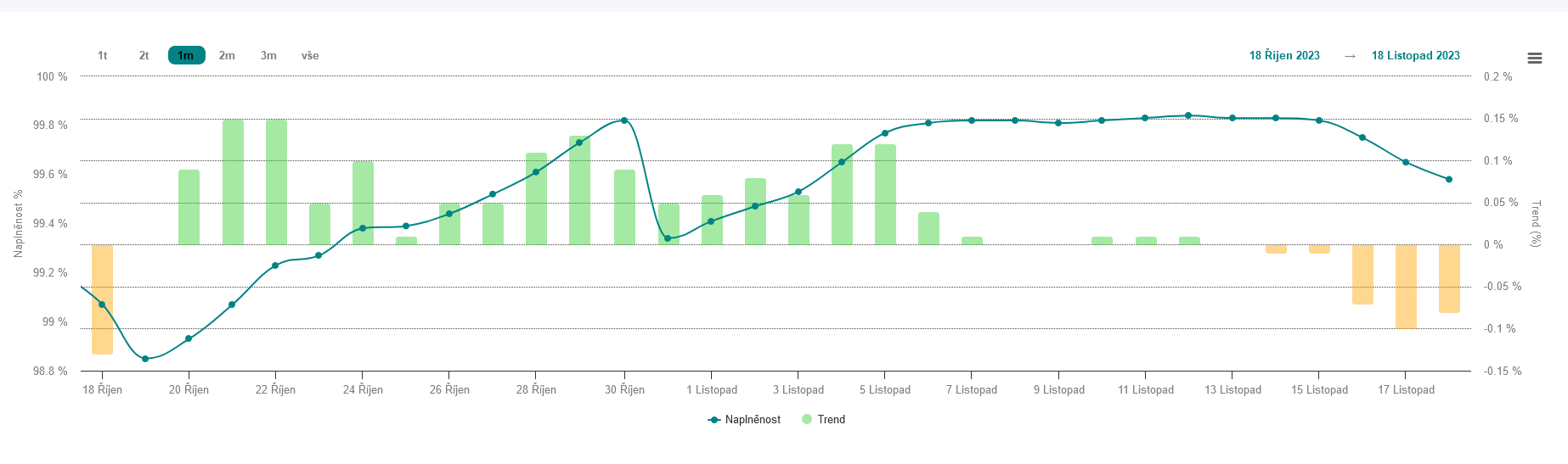 Zásoby plynu v Česku tak k 18.11. dosáhly 99,58% naplněnosti zásobníků.