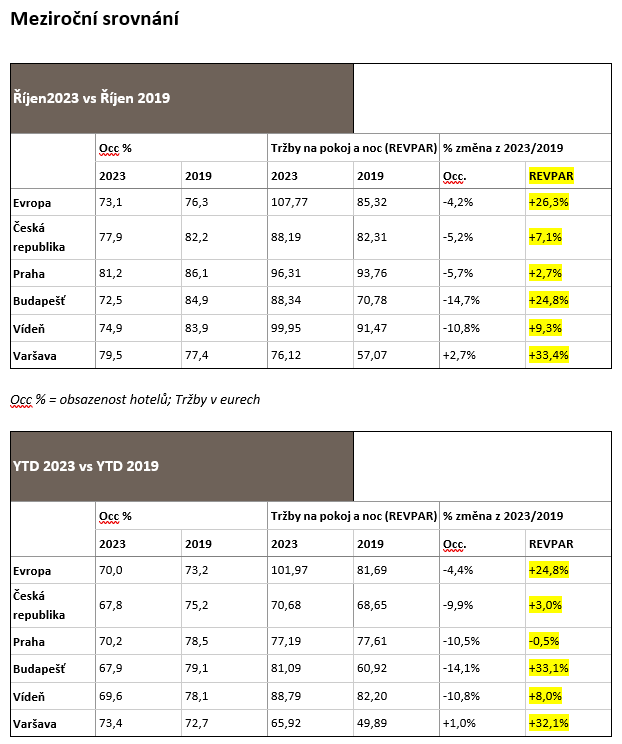 Porovnání s rokem 2019 je ovšem pro české hotelnictví smutné čtení a propad výkladní skříně našeho průmyslu. Zejména celoroční (YTD – tedy leden-říjen) data ukazují růst Evropy o cca čtvrtinu, růst Budapešti a Varšavy o třetinu a pokles Prahy o 0,5 %. Nezapomínejme přitom, že za tyto tři roky je růst nákladů (a inflace) v desítkách procent.