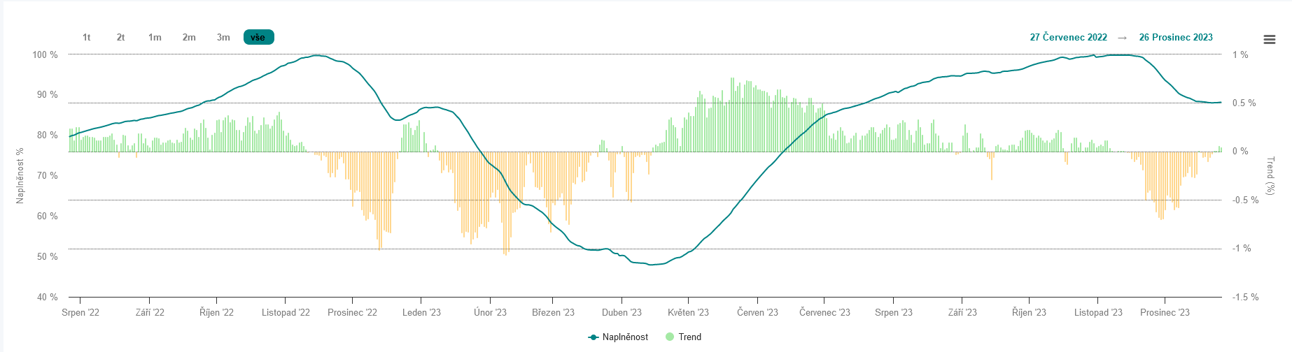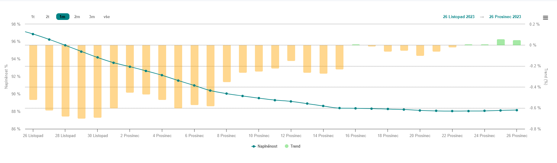 Zásoby plynu v Česku k 26.12. dosáhly 88,16% naplněnosti zásobníků. V porovnání dat z minulého roku vyplývá, že letos jsou zásoby zhruba o 3 % vyšší než ve stejném odbobí loňského roku, dne 26.12. 2022 byly 85,39 %.