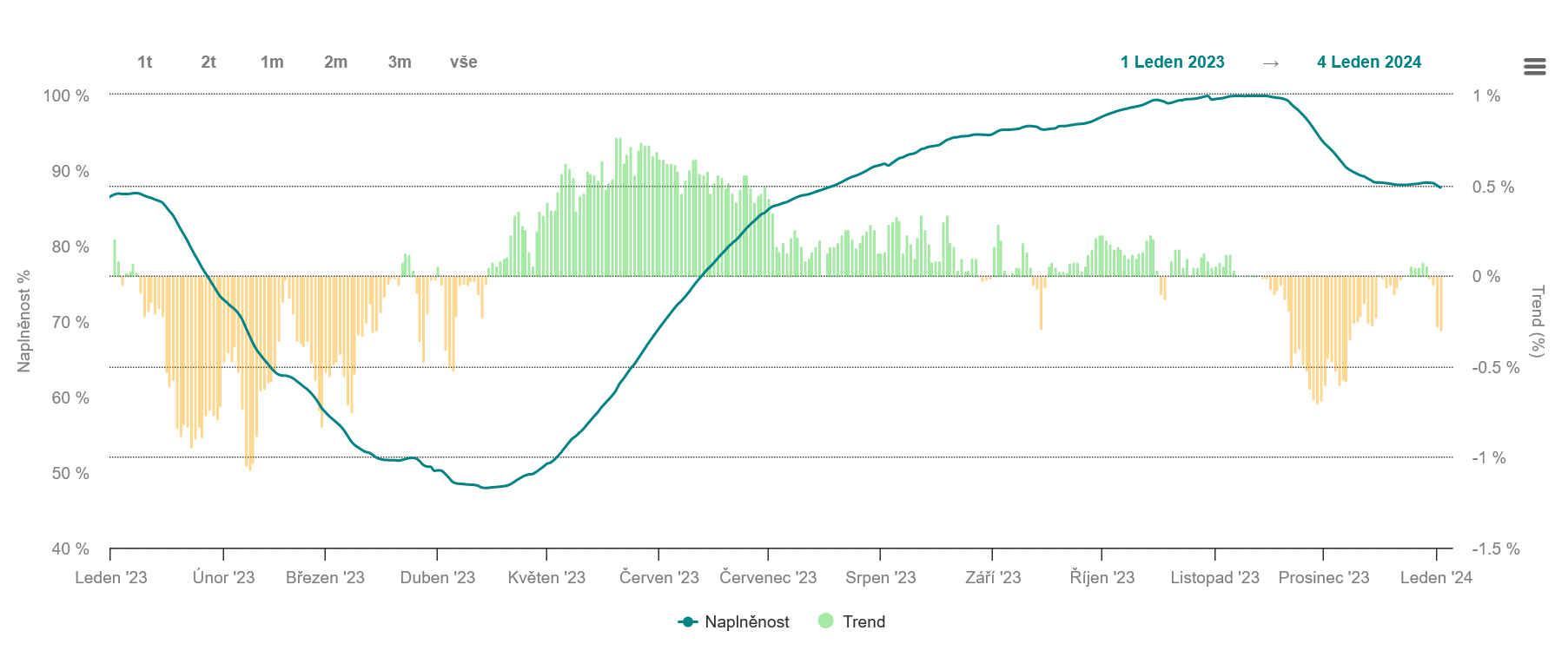 Zásoby plynu v Česku k 2.12. dosáhly 87,69% naplněnosti zásobníků. V porovnání dat z minulého roku vyplývá, že letos jsou zásoby zhruba o 1 % vyšší než ve stejném odbobí loňského roku, kdy dne 2.1. 2023 byly naplněny z 86,8 %.
