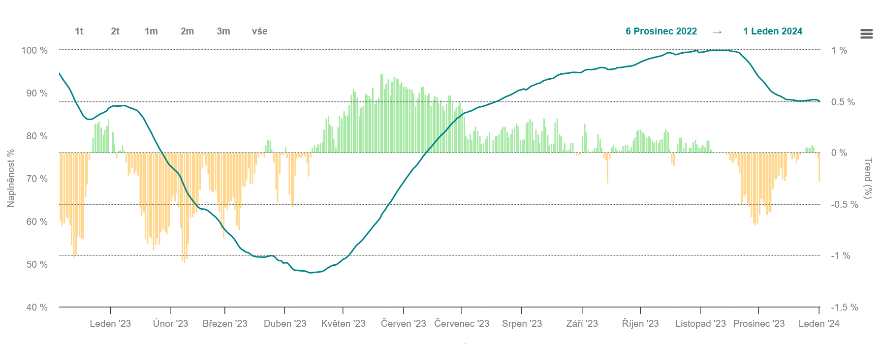 Zásoby plynu v Česku k 7.1. dosáhly 85,88% naplněnosti zásobníků. Z porovnání dat s minulým rokem vyplývá, že letos jsou zásoby zhruba o 1 % nižší než ve stejném odbobí loňského roku, kdy dne 7.1.2023 byly naplněny z 86,93 %.