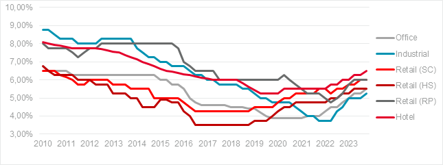 Investiční trh v České republice zažíval v posledních dvou letech tlak na snižování cen nemovitostí. Od roku 2022 výnosové míry vzrostly ve všech sektorech nemovitostního trhu.
