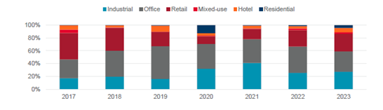 V rámci regionu byl poměr odlišný: největší část objemu investic mířila do kanceláří, i když oproti 41 % v roce 2022 to loni bylo méně – 32 %. Následoval industriální a retailový sektor – oba s objemem lehce nad 27 %, který korespondoval s předloňskými 26 %.