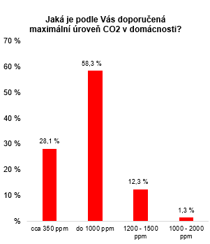 O tom, jaká je maximální doporučená hladina CO2 v domácnosti, tedy 1 200 - 1 500 ppm, ví však pouze více než desetina Čechů. Celkem 58 % lidí se poté domnívá, že se jedná o hladinu do 1 000 ppm. Ta se však nejčastěji uvádí jako doporučená a tedy ideální.