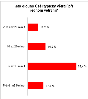 Průzkum se zaměřil i na návyk Čechů větrat. Celkem 79 % Čechů si je vědomo tří hlavních zásad: větrání by mělo být krátké, intenzivní a časté. Přes pětinu Čechů si však bohužel zásady efektivního větrání stále neosvojilo. Celkem 10 % z nich větrá dlouze s polootevřeným oknem či oknem otevřeným pouze na ventilaci nebo mikro-větrání. Dalších 10 % používá stejné způsoby, a navíc větrá pouze krátce.